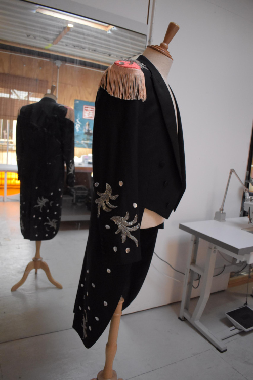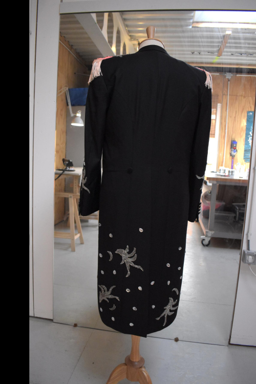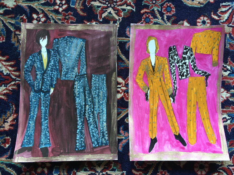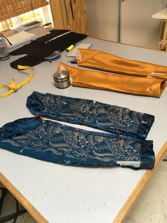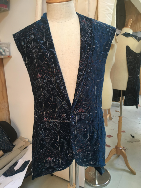 Een bijzonder project waar ik al mijn creativiteit in kwijt kon. Op maat gemaakte tweedelige pakken gemaakt van geborduurde katoen velours met een voering van taftzijde en een pak gemaakt van dupion zijde met een dupion zijden voering.