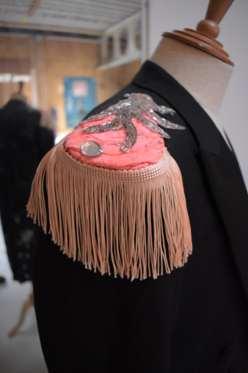 Voor dit bruidspaar heb ik de jurk veranderd in een rok met elastische binnenband. De applicaties van de top heb ik gebruikt voor op de manchetten en op de rok van de rokjas. Daarna heb ik epauletten gemaakt van de buste van de top.