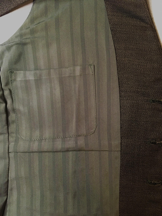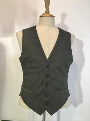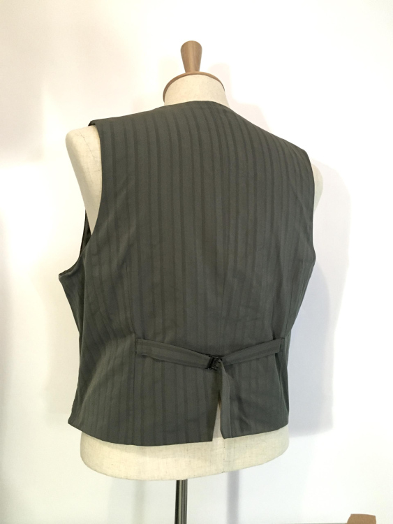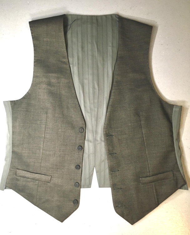 Gilet gemaakt van wol en gestreepte viscose voering. Het gilet heeft een een binnenzakje, twee strookzakken, split op de middenachter en hoornen knoopjes met handgemaakte knooopsgaten.