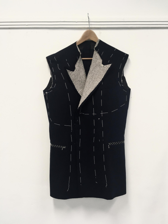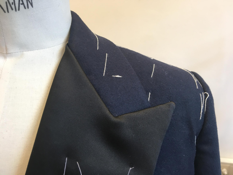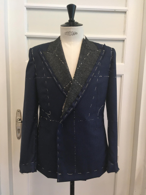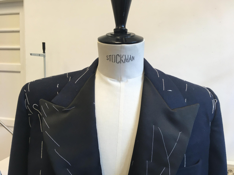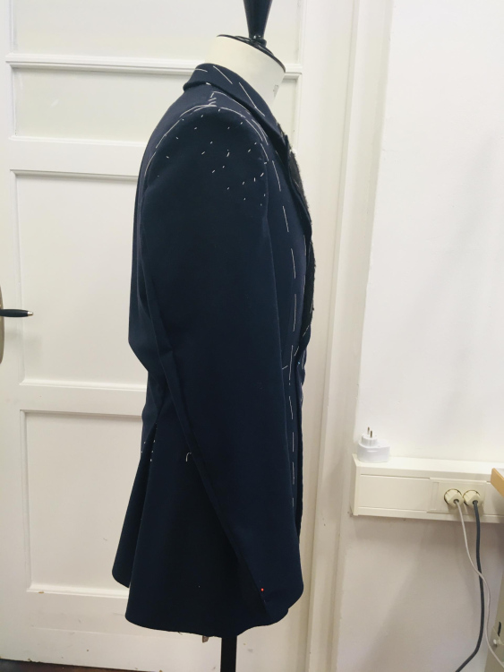 De verdieping in dit kledingstuk zit vooral in het verwerken van een losse tussenvoering/versteviging achter de voorpanden. Deze versteviging wordt geheel met de hand verwerkt en is de basis van een ambachtelijk gemaakt colbert.
