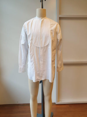 Onderzoek tijdens mijn opleiding naar het historische hemd. Een reconstructie van een bestaand hemd uit +/- 1910. Het katoenen hemd bestaat uit een aangestikt plastron gemaakt van piqué, piqué manchetten met kerktorensplit, een staander met verborgen knoopsgat middenachter, stolpplooi op het rugpand en zijsplitten met driehoek.